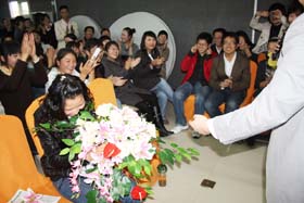 王麗經(jīng)理深情獨唱,客服部美女歌聲甜美,場下fans奮勇獻花